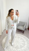 Conjunto no tecido de tricot mousse. Ele é composto por 3 peças, sendo um casaquinho todo trabalhado com detalhes nas mangas, uma regatinha linda e uma calça pantalona com detalhe de elástico e cordinhas para ajustar na cintura. Possui um caimento impecável. Ótimo para os dias mais frios e também tem a opção de usar as peças separadas, fazendo muitas composições estilosas.